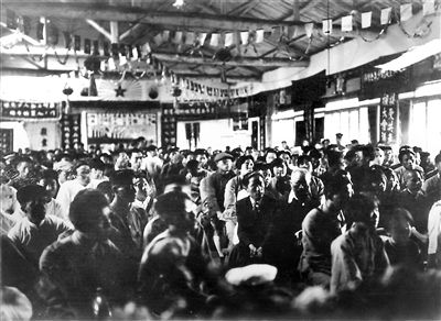 展品中,有兩張從俄羅斯征集來的照片尤為珍貴,是當年中共五大會場照片,系第一次在國內(nèi)公開展出。照片上,與會代表們正聚精會神聽取大會報告(圖2)。