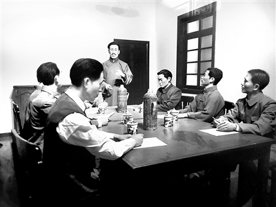圖5:圖為1927年5月10日,中央監(jiān)察委員會成員召開會議的模擬場景。站立者為王荷波,其右手起逆時針依次為:楊匏安、張佐臣、劉峻山、蔡以忱、楊培森、周振聲、許白昊。蕭石月、阮嘯仙沒有參加會議。