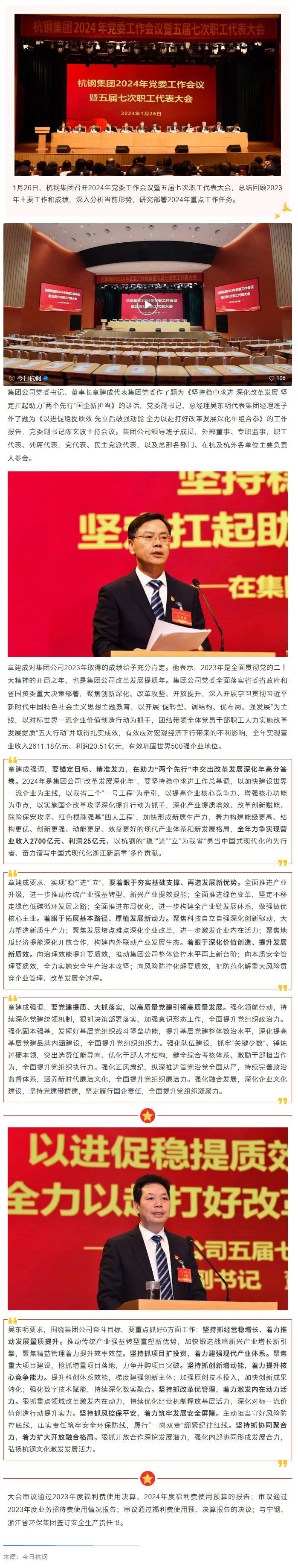 杭鋼集團召開2024年黨委工作會議暨五屆七次職工代表大會發(fā)布日期:2024-01-26